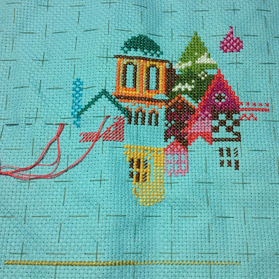 I have started to add faint outlines so maybe you can start to see what it is...? I realised that I had to start stitching the background too, since it is much more boring than the colourful buildings in the middle, and I don't want to risk being left with only the boring background and then loose my stitching mojo in the process...! Let's hope my plan works lol:)